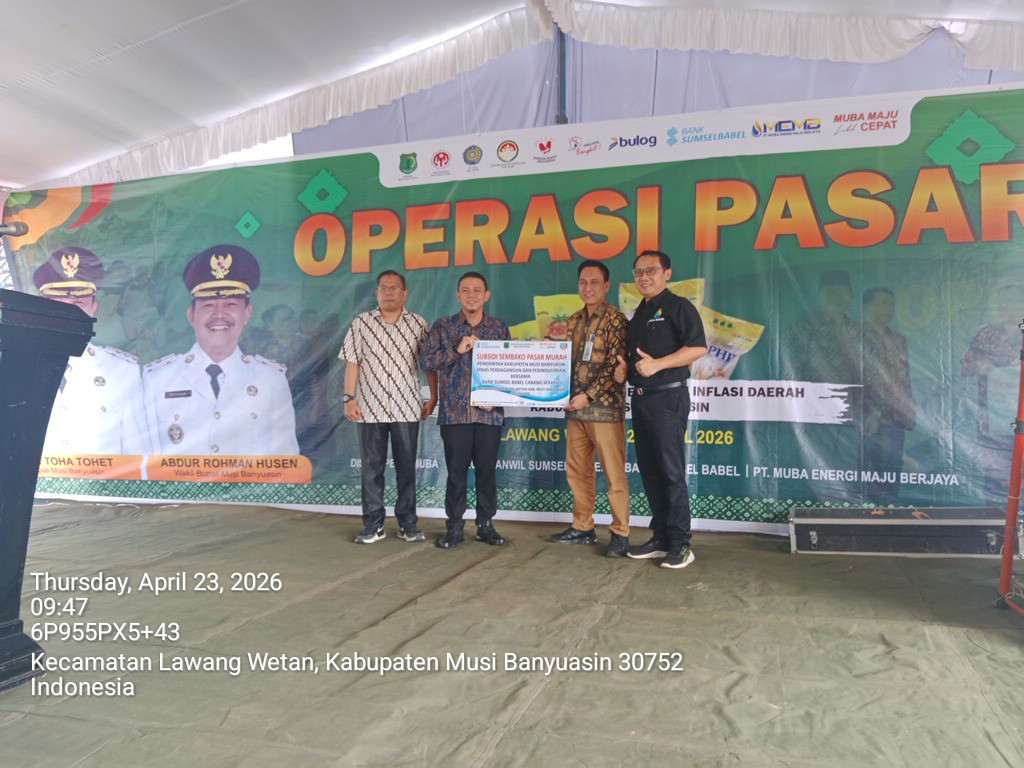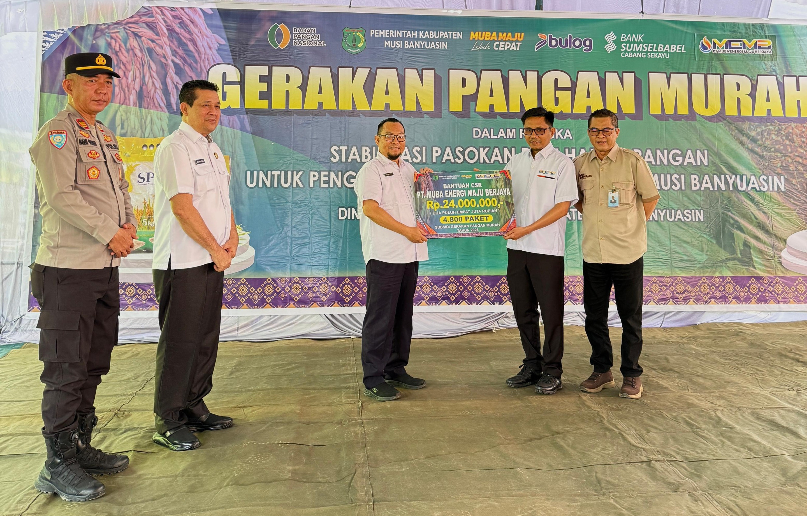 Direktur Utama PT. Muba Energi Maju Berjaya (Perseroda) Bapak H. DONNY MEILANO, bersama Kepala Cabang Bank SumselBabel Bapak IRWAN ANTONI menyerahkan Bantuan Gerakan Pangan Murah Tahun 2026 untuk masyarakat Kecamatan Sekayu, Kecamatan Lais dan Kecamatan Babat Supat kepada Sekretaris Daerah Kabupaten Musi Banyuasin Bapak SYAFARUDDIN melalui Plt. Kepala Dinas Ketahanan Pangan Bapak APRIYADI, disaksikan oleh Kasat Binmas Polres Musi Banyuasin Bapak AKP. BENI.